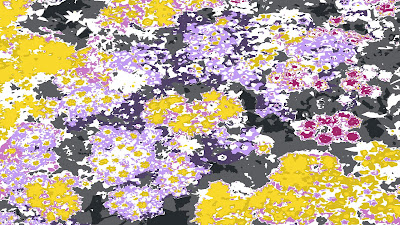 A large area of marigolds --- yellow and orange , changed into floral print ...